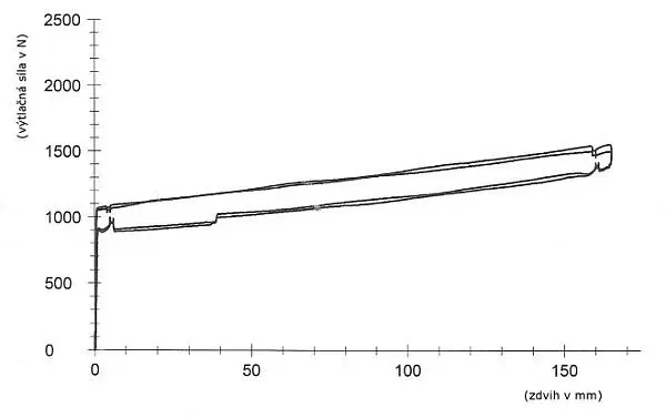 Pokud Vás zajímá fukce vzpěr do větší hloubky či jednoduše patříte k technicky zvídavým jedincům, pak níže přikládáme i graf závislosti průběhu síly vzpěry na zdvihu - na něm je vidět, že síla vzpěry není konstantní, nýbrž se po délce zdvihu mění. (S tím je třeba počítat i při návrhu nových vzpěr, což v našich návrzích vždy děláme).